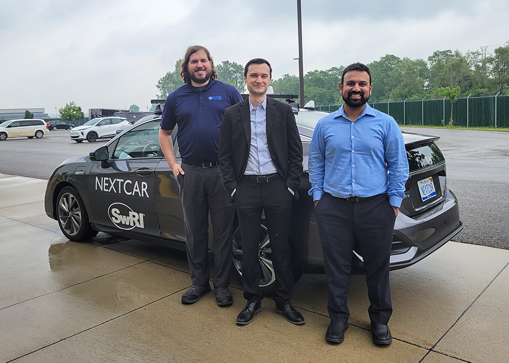 SwRI engineers — including (left to right) Robert Harold, Stas Gankov and Piyush Bhagdikar —demonstrated SwRI’s NEXTCAR vehicle at the June 5, 2025, ARPA-E Field Day event at the American Center for Mobility in Ypsilanti Township, Michigan. Guided by the